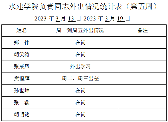 » 六合彩结果 负责同志外出情况统计表(第五周)