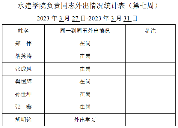 » 六合彩结果 负责同志外出情况统计表(第七周)