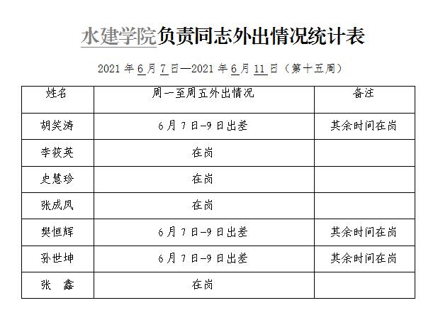六合彩结果 负责同志外出情况统计表(第十五周)
