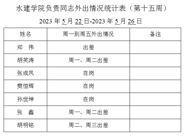 六合彩结果 负责同志外出情况统计表(第十五周)