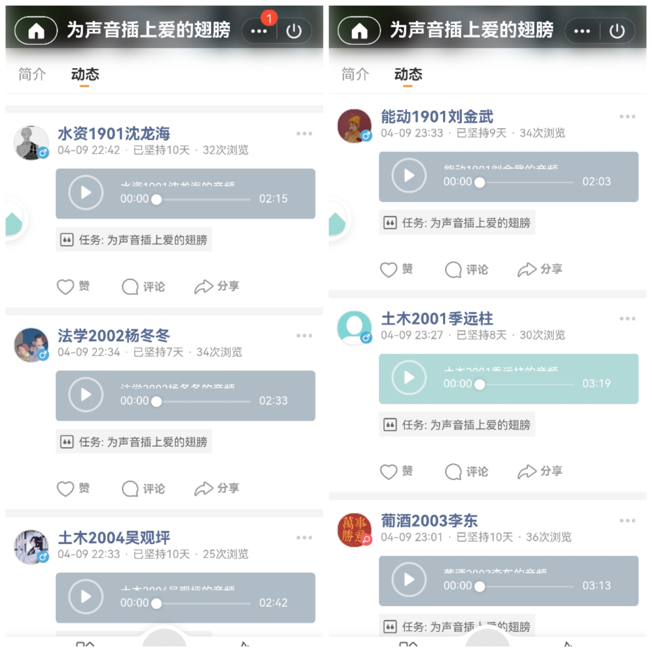 活动期间,同学们认真完成每日的签到,在小程序中每天都能感受到满满的爱意。有的同学情绪昂扬的抒发着对祖国的热爱,“亲爱的祖国,让我们以采薇采茶采桑的双手,编织彩灯云锦……唱响国歌和飘扬的五星红旗”,有的同学声情并茂地吟唱着亲情的伟大,“母亲,您像一条河,流淌着生命的水源,供我成长……”,也有的同学朗诵着泰戈尔诗集中对生活的热爱,“生如夏花之绚烂”……文字比声音有力量,声音却比文字更有感染力。
