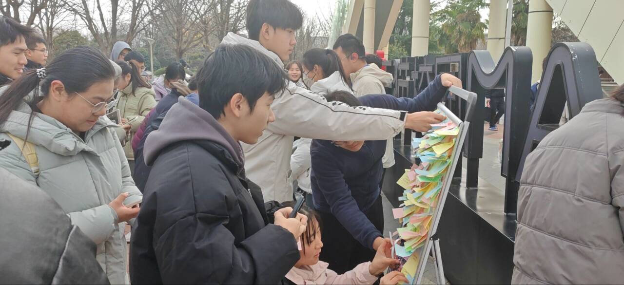 12月8日,本次活动于北校区西雕广场正式举行。活动共有两种参与方式:【一】家乡特色照片收集:同学们提前准备5寸大小的照片,并在指定时间内到达西雕广场交给工作人员,由工作人员进行张贴展览。【二】书写对家乡的寄语:同学们把自己对家乡的美好寄语写在工作人员事先准备好的便利贴上,并粘贴到展览板上。