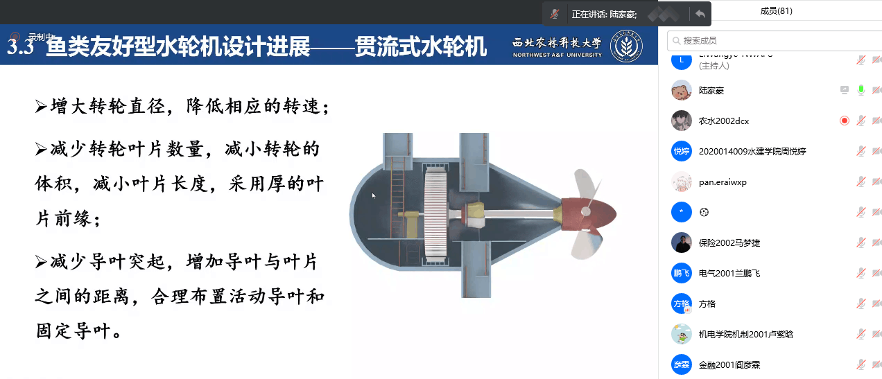 活动伊始,陆家豪学长由2020年我国十四五规划中提出的“推动绿色发展,促进人与自然和谐共生”的发展理念,引出了“亲鱼型水轮机”设计的背景,并对“亲鱼型水轮机”项目的目的以及意义进行了介绍。随后,就鱼类经过水轮机的四种受伤机理进行了说明,针对“亲鱼型水轮机”的设计原理进行了细致的讲解。紧接着,通过不同型式水轮机三维模型及动画,同学们学习了“亲鱼型”改型设计的方法及原理。
