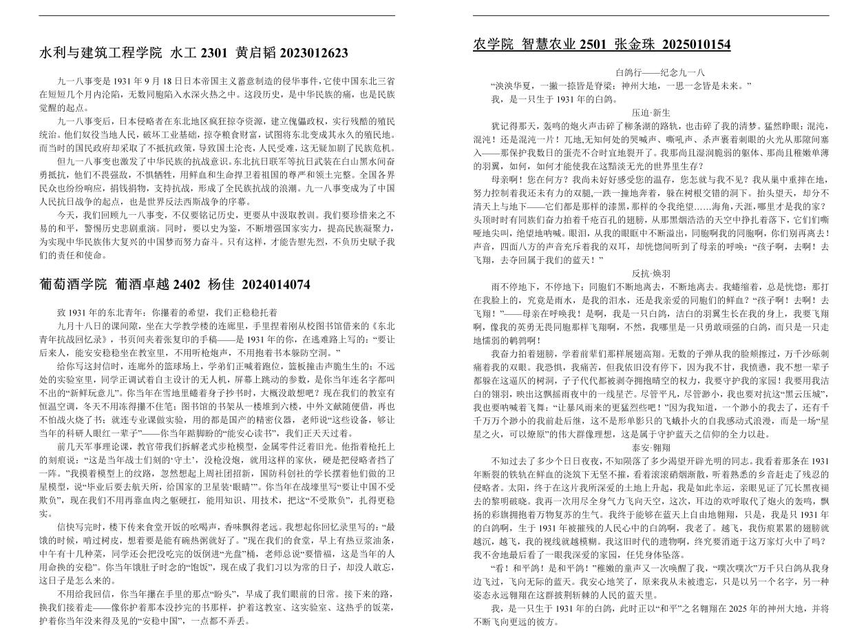 九一八,是一页刻骨铭心的历史,是一曲民族觉醒的壮歌。为深切缅怀革命先烈,弘扬爱国主义精神,引导广大青年学子铭记历史、奋发图强,由西农创新者联盟与青马社农学分社联合举办的“铭记历史,吾辈自强”——纪念‘九一八’事变主题征文活动于2025年9月17日至9月23日顺利开展并圆满落幕。本次活动以线上形式进行,面向全校本科生征集文稿,得到同学们的积极响应。