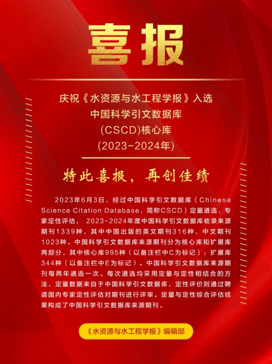 《水资源与水工程学报》于2017年起被中国科学引文数据库CSCD(扩展库)收录,经过多年的努力,自2019年至今,连续三届进入CSCD(核心库)来源期刊。