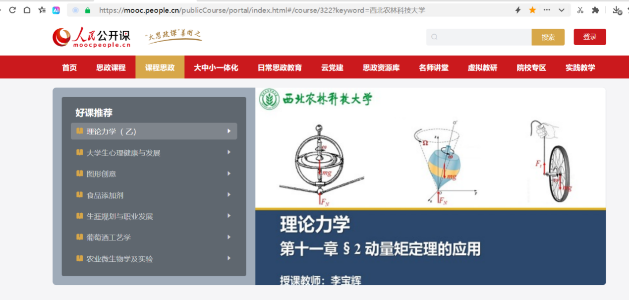近日,经专家审核、西北农林科技大学教发中心推荐,由六合彩结果 教师李宝辉讲授的《理论力学》(乙)课程思政教学案例——动量矩定理的应用,在文华在线-人民公开课-大思政课MOOC平台上线。